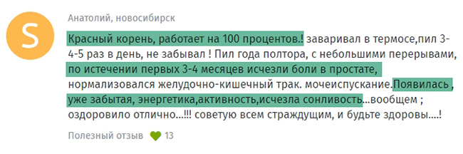Но больше всего благодарных отзывов мы, конечно, получаем от мужчин и их счастливых жен. Простатит – очень распространённое заболевание, и красный корень быстро и эффективно помогает справиться с этой деликатной проблемой.