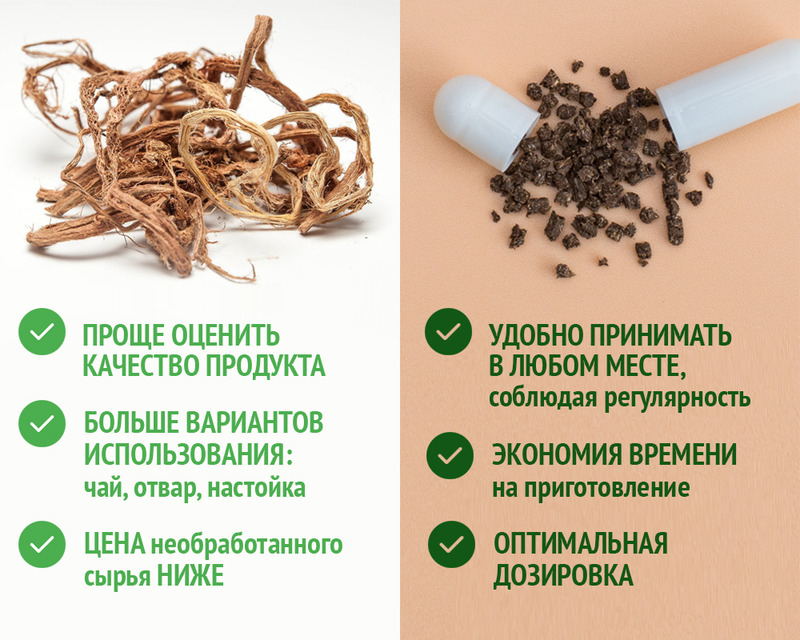 Капсулы – наиболее экологичный и удобный формат для приёма внутрь. В отличие от таблеток, фитоэкстракт в капсуле не подвергается увлажнению, прессованию, нагреву – процессам, которые влияют на сохранность и активность действующих веществ.