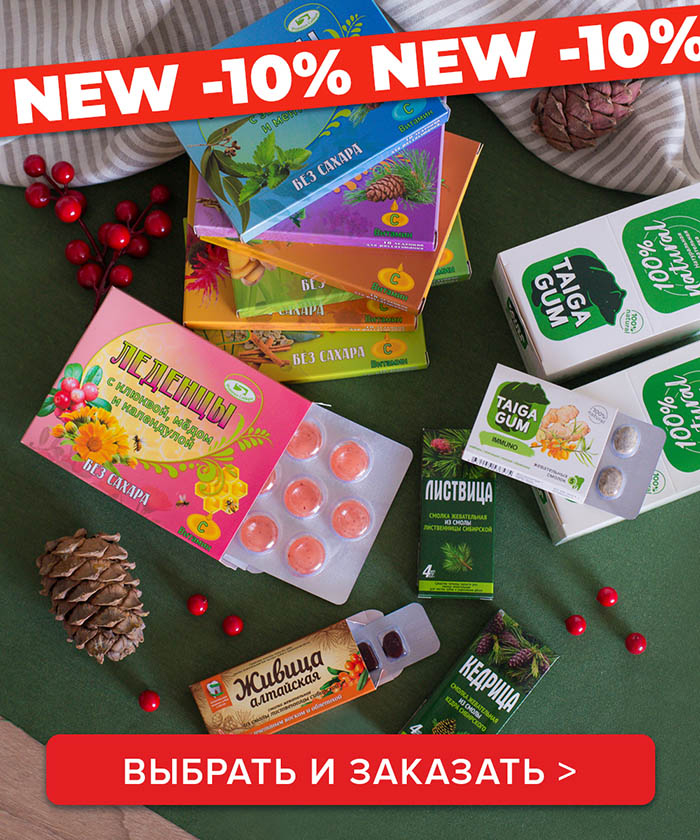 Жевательные смолки. Полезная альтернатива жевательной резинке, которая не только освежает дыхание, но и оздоравливает. Смолы лиственницы и кедра в сочетании с пчелиным воском сохраняют здоровую микрофлору полости рта и защищают зубы от кариеса. Активные экстракты трав начинают усваиваться уже в рту, минуя ЖКТ, и помогают снизить никотиновую зависимость, аппетит, укрепить иммунитет, зрение, обладают успокаивающим или, напротив, тонизирующим действием. Всего 8 видов полезных смолок. Заказать >
