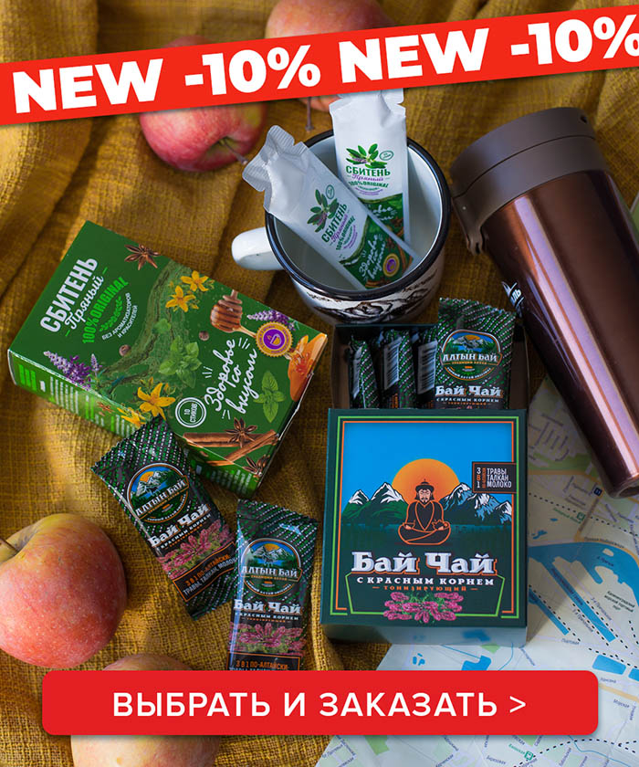 Бай Чай – традиционный напиток жителей алтайских гор. Образ жизни людей, с древних времен населявших алтайские земли, способствовал зарождению особой культуры питания, неповторимой и самобытной. Сама природа, неотъемлемой частью которой был человек, помогала создавать рецепты для поддержания высокого энергетического уровня. Байчай - напиток, содержащий только натуральные продукты: экстракты трав алтайских высокогорий, молоко, молотые злаки. Такое сочетание благоприятно действует на организм: кочевники верили, что регулярное употребление такого чая способствует растворению холестериновых и солевых отложений в сосудах, суставах, позвоночнике, печени и почках, стимулирует работу кишечника и снижает интоксикацию, нормализует уровень сахара в крови, замедляет старение. Всего 4 вида необычного и очень вкусного напитка: тонизирующий с красным корнем, общеукрепляющий с кедровым орехом, иммунный с баданом и чагой, успокаивающий с курильским чаем и душицей. Заказать >