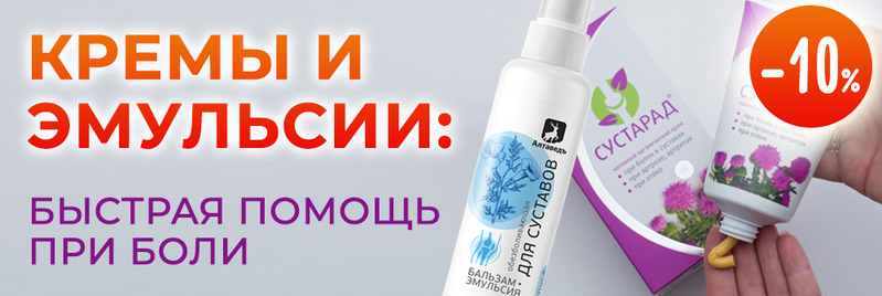Например, обезболивающий бальзам-эмульсия "Для суставов" от Алтаведъ, который поможет при подагре, возрастных изменениях суставов, большой физической нагрузке, механических повреждениях тканей, костей и суставов. Эмульсия уменьшает острую боль в области суставов, мышц, и воспаление при ревматических заболеваниях.