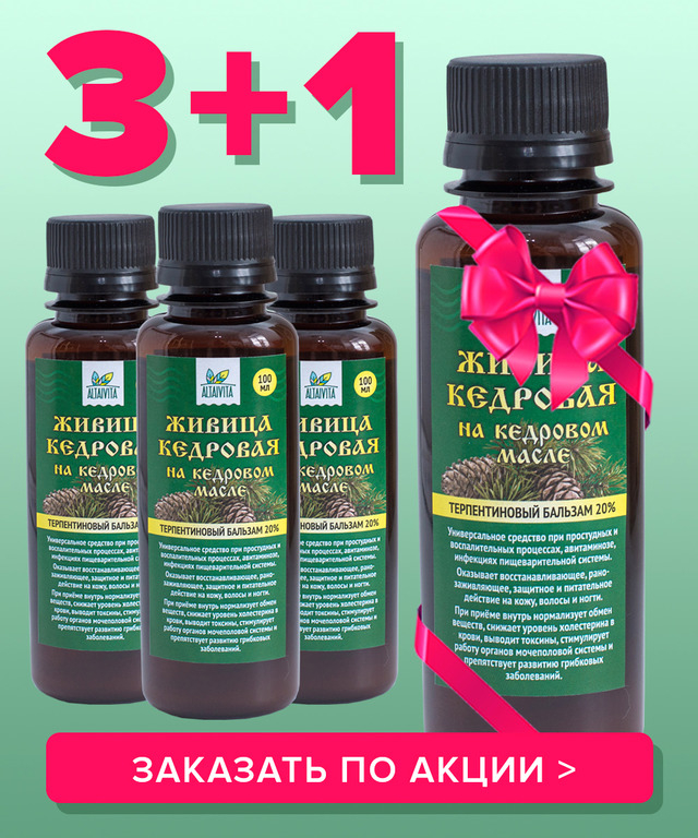 С 12 по 24 июля новинка участвует в акции 3+1, т.е., заказав 3 баночки кедрового терпентина, ещё одну получите БЕСПЛАТНО.